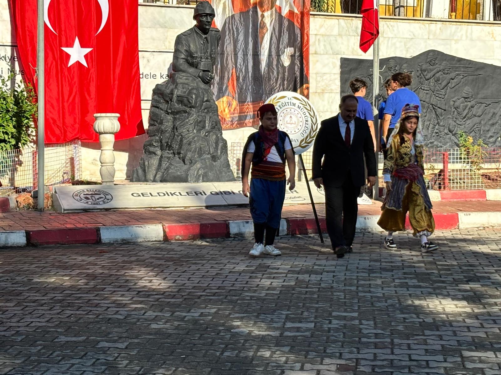 2025-2026 Eğitim Öğretim Yılı İlköğretim Haftası Programı İlçe Milli Eğitim Müdürümüz Sn. Mustafa VURAL' ın Atatürk Anıtı'na çelenk sunumuyla başladı. Tören, ebedi önderimiz Gazi Mustafa Kemal Atatürk ve tüm şehitlerimiz anısına yapılan saygı duruşu ve ardından okunan İstiklal Marşı ile devam etti.